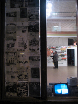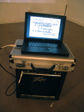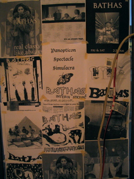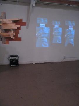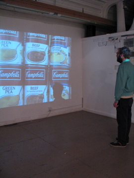 Images from Top to Bottom: #1.) Master List 2000 preparing for the Gallery talk, #2.) Curator A. Bill Miller, #3.) Re:Flux video still, #4.) BATHAS Window display, #5.) Annushka Gisella Peck, #6.) BATHAS Display, #7.) BATHAS Flyers, #8.) Nathaniel Stern, #9.) Major General Reality (projection), Master List 2000 (resting), and Annushka’s sculpture #10.) Soup Cans (projection).