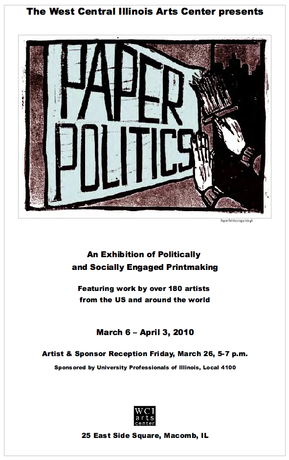 West Central Illinois Arts Center is excited to announce the opening of Paper Politics a major exhibition of politically and socially engaged printmaking. Paper Politics can be seen at the WCI Arts Center Gallery March 6 through April 3. The WCI Arts Center is located at 25 East Side Square in Macomb, Illinois. The Gallery is open Fridays from noon to 4:00 p.m. and Saturdays from 10:00 a.m. to 4:00 p.m. An artist and sponsor reception is planned for Friday, March 26, from 5:00 p.m. to 7:00 p.m.