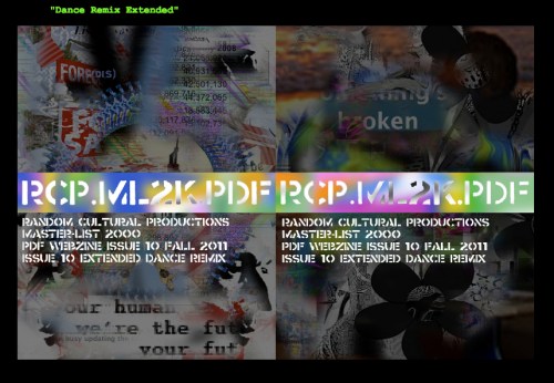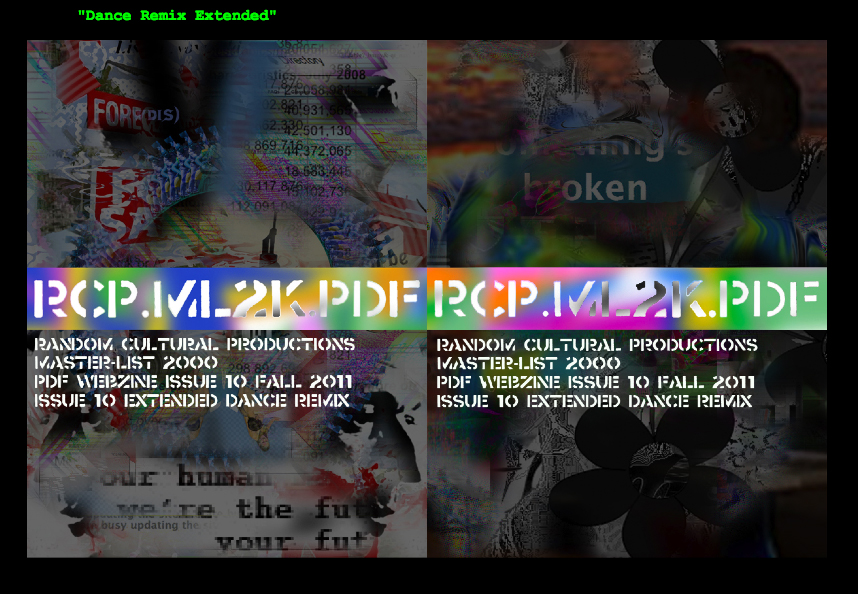 RCP.ML2K.PDF Issue #10 “Extended Dance Remix” is now out! RCP.ML2K.PDF is a PDF webzine available for download online, and is a collaboration between A. Bill Miller and myself. The project explores image circulation, as well as the fluid and adaptable nature of images in the digital environment. The project was developed with the intent to create an artwork that participates in the gift economy of file sharing. This is our tenth issue and we’ve been going strong for about two years now with regular quarterly issues. This issue also features contributions and remix work by Simon Baker, Sara Caron, Michael Manning, and Dean Valadez!