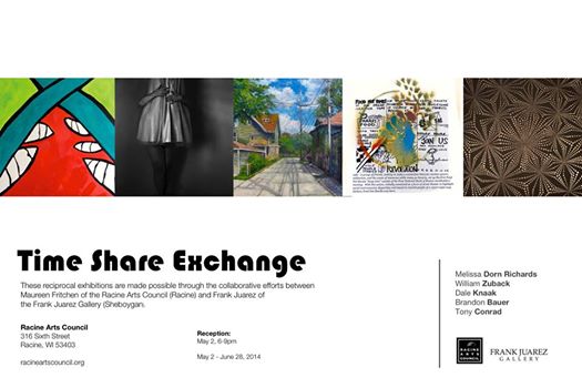 In May I participated in two exhibitions through the Frank Juarez Gallery– Indiana Green and the Racine Arts Council Time Share Exchange exhibition. Indiana Green is celebrating its 5th year as an annual curated exhibition of regional contemporary art. This year the exhibition was held at the Cedarburg Cultural Center and included a catalog. Indiana Green runs from May 2nd through June 22nd (2014). The Racine Arts Council Time Share Exchange exhibition is a collaboration between the Frank Juarez Gallery and the Racine Arts Council each organizing to exhibit work at the other venue. My work was included along with Melissa Dorn Richards, William Zuback, Dale Knaak, and Tony Conrad. The exhibition runs from May 2nd through June 28th.