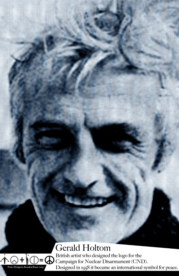 I made this poster about Gerald Holtom for a project in 2013, but ended up not using it. I just found it again and thought I would post it here. Gerald Holtom was a British artist and conscientious objector. He designed a nuclear disarmament logo for the first Aldermaston March, organised by the Direct Action Committee against Nuclear War on Easter weekend in 1958. The symbol was a composite of the basic semaphore signals for the letters N and D – for “Nuclear Disarmament”. The symbol soon became the official logo of the British Campaign for Nuclear Disarmament (CND), and eventually became an international symbol for peace.