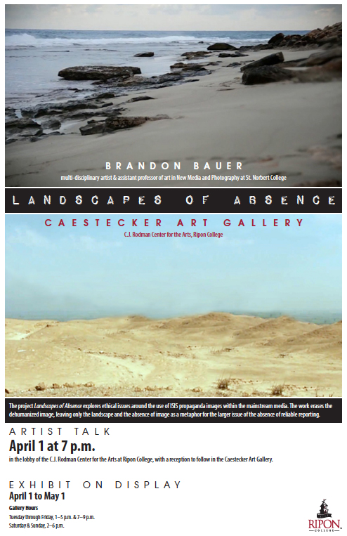 My exhibition Landscapes of Absence will be on view April 1 through May 1 in the Caestecker Gallery, at the C.J. Rodman Center for the Arts, on the campus of Ripon College. An artist’s talk will be presented at 7 p.m. April 1 in the Rodman lobby, and a reception will follow in the gallery.