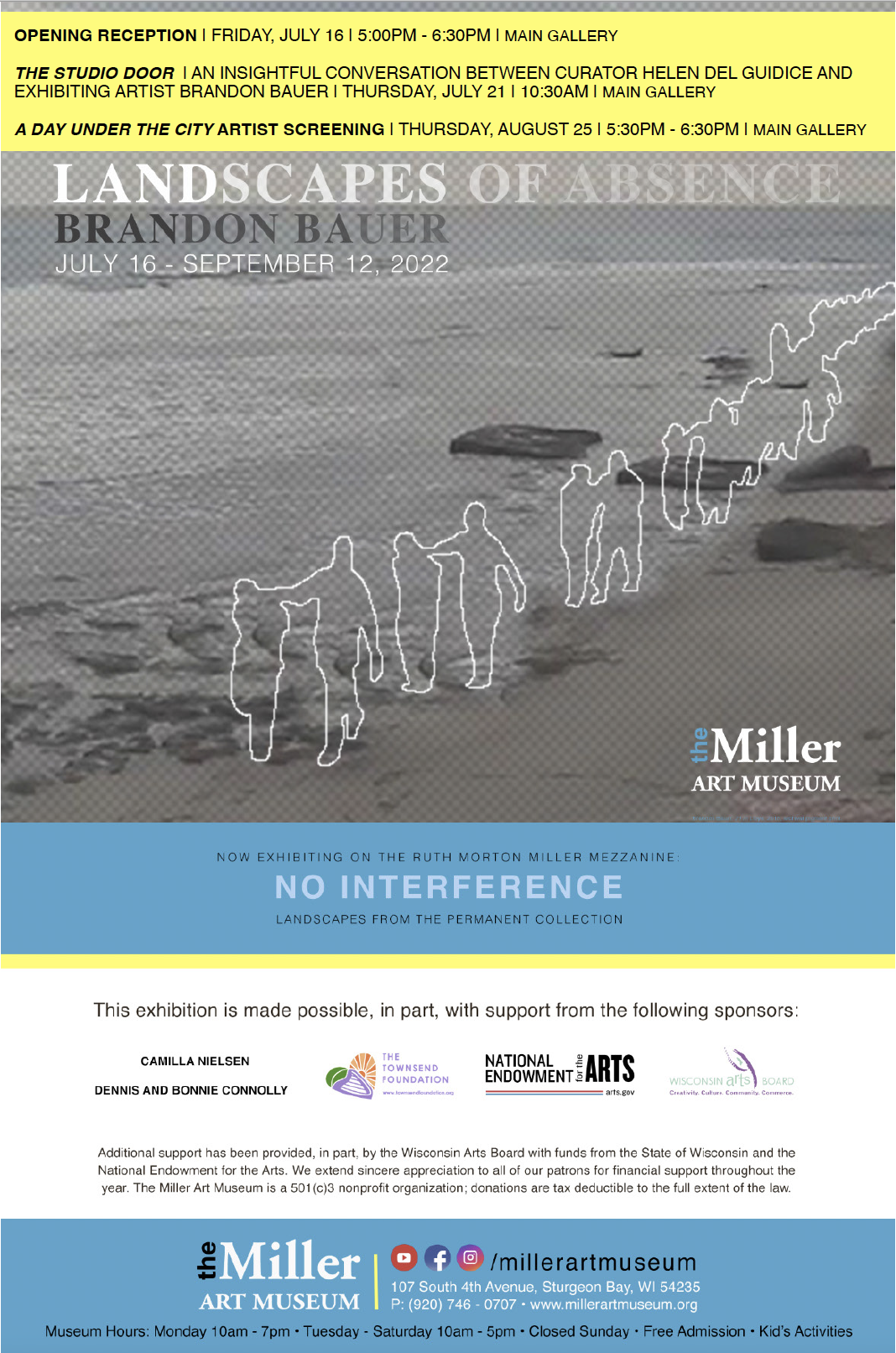 My project ‘Landscapes of Absence’ will be on view at the Miller Art Museum in Sturgeon Bay, WI from July 16th through September 12, 2022. The exhibition in the main gallery is complemented by selections of other projects that provide a context for this work within my larger body of work. On view will be selections from the short/cuts video sketchbook series, the two-channel video installation ‘These Visions’, and selections from the ‘Acceleration Fragments’ photography print portfolio. Also on display will be the exhibition ‘No Interference – Landscapes from the Permanent Collection’ on the Ruth Morton Miller Mezzanine level. This exhibit offers an opportunity to examine our emotional and spiritual responses to nature untouched by human presence.