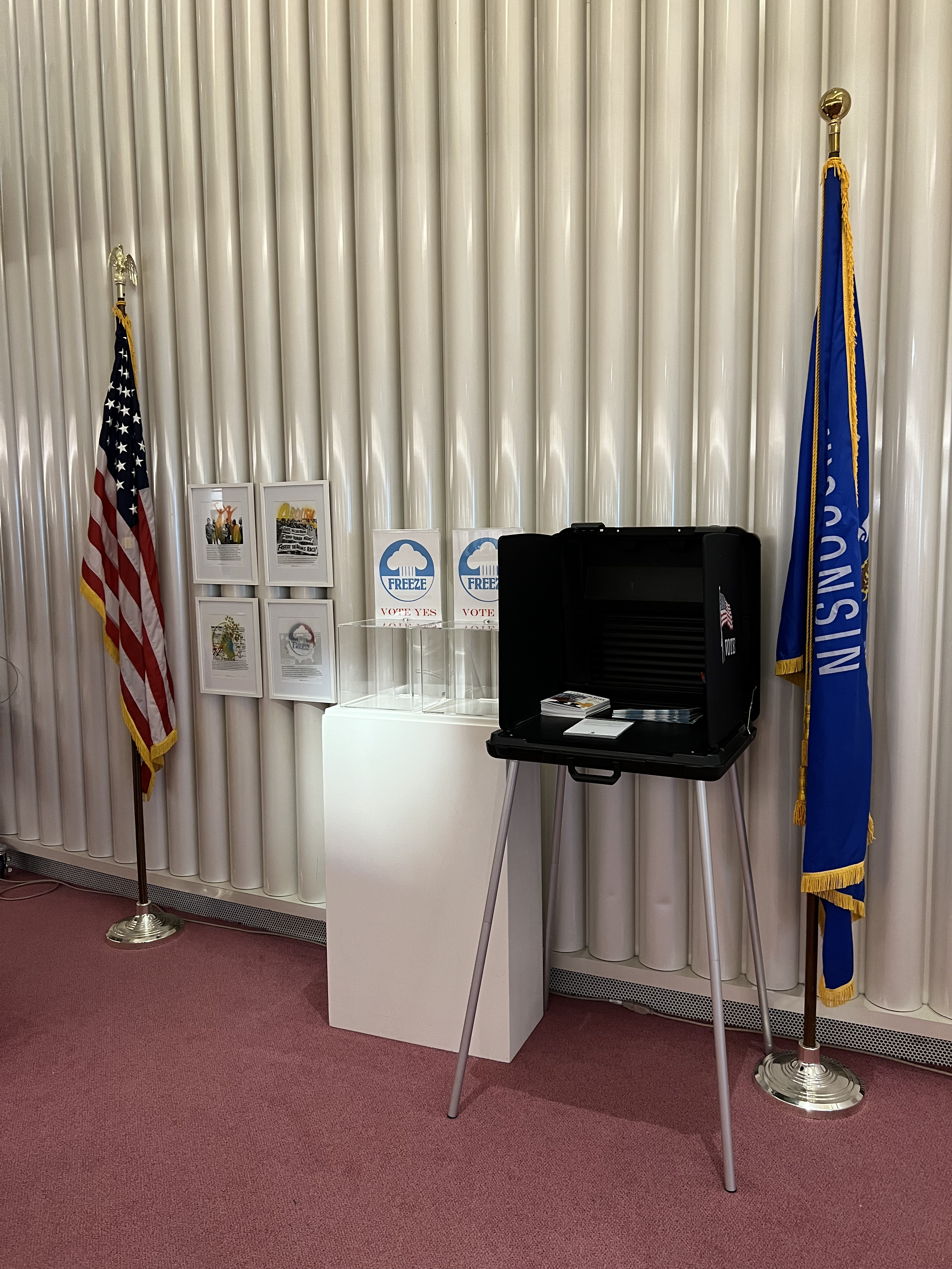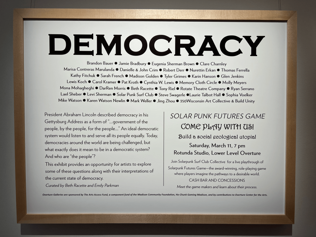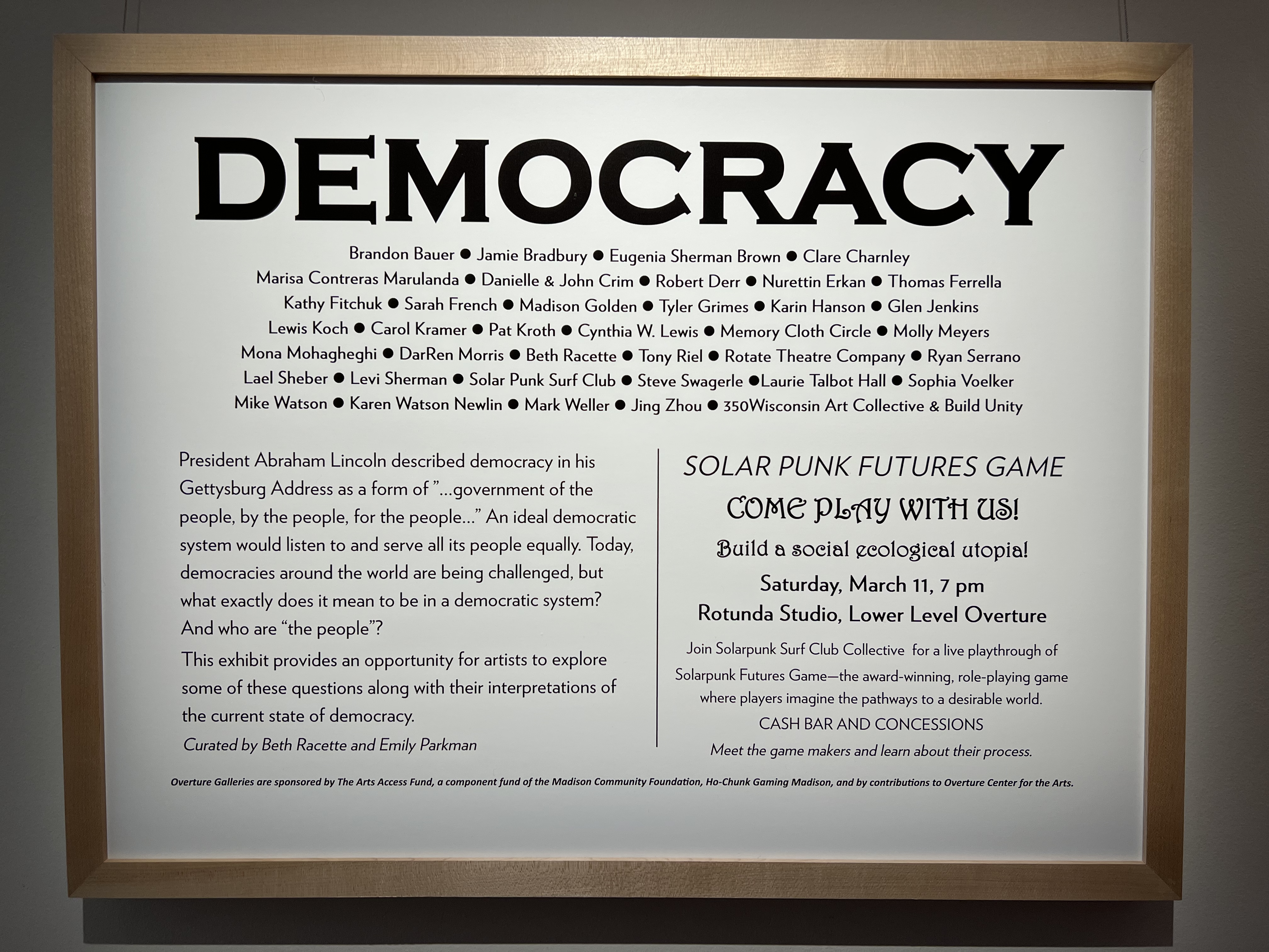 Democracy Exhibition Artists: Brandon Bauer • Jamie Bradbury • Eugenia Sherman Brown • Clare Charnley • Marisa Contreras Marulanda • Danielle and John Crim • Robert Derr • Nurettin Erkan • Thomas Ferrella • Kathy Fitchuk • Sarah French • Madison Golden • Tyler Grimes • Karin Hanson • Glen Jenkins • Lewis Koch • Carol Kramer • Pat Kroth • Cynthia W. Lewis • Holly Meyers • Mona Mohagheghi • DarRen Morris • Leslee Nelson • Beth Racette • Tony Riel • Rotate Theatre Company • Ryan Serrano • Lael Sheber • Levi Sherman • Solar Punk Futures • Steve Swagerle • Laurie Talbot Hall • Sophia Voelker • Mike Watson • Karen Watson • Newlin • Mark Weller • Jing Zhou • 350 Wisconsin Art Collective